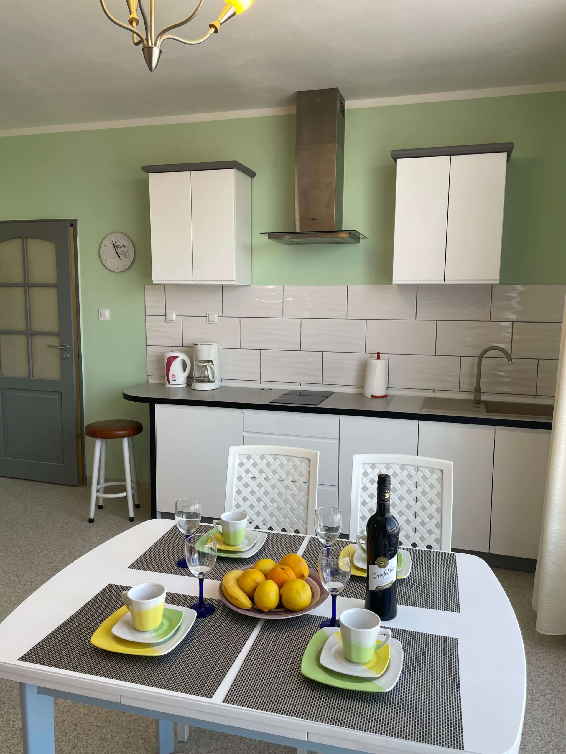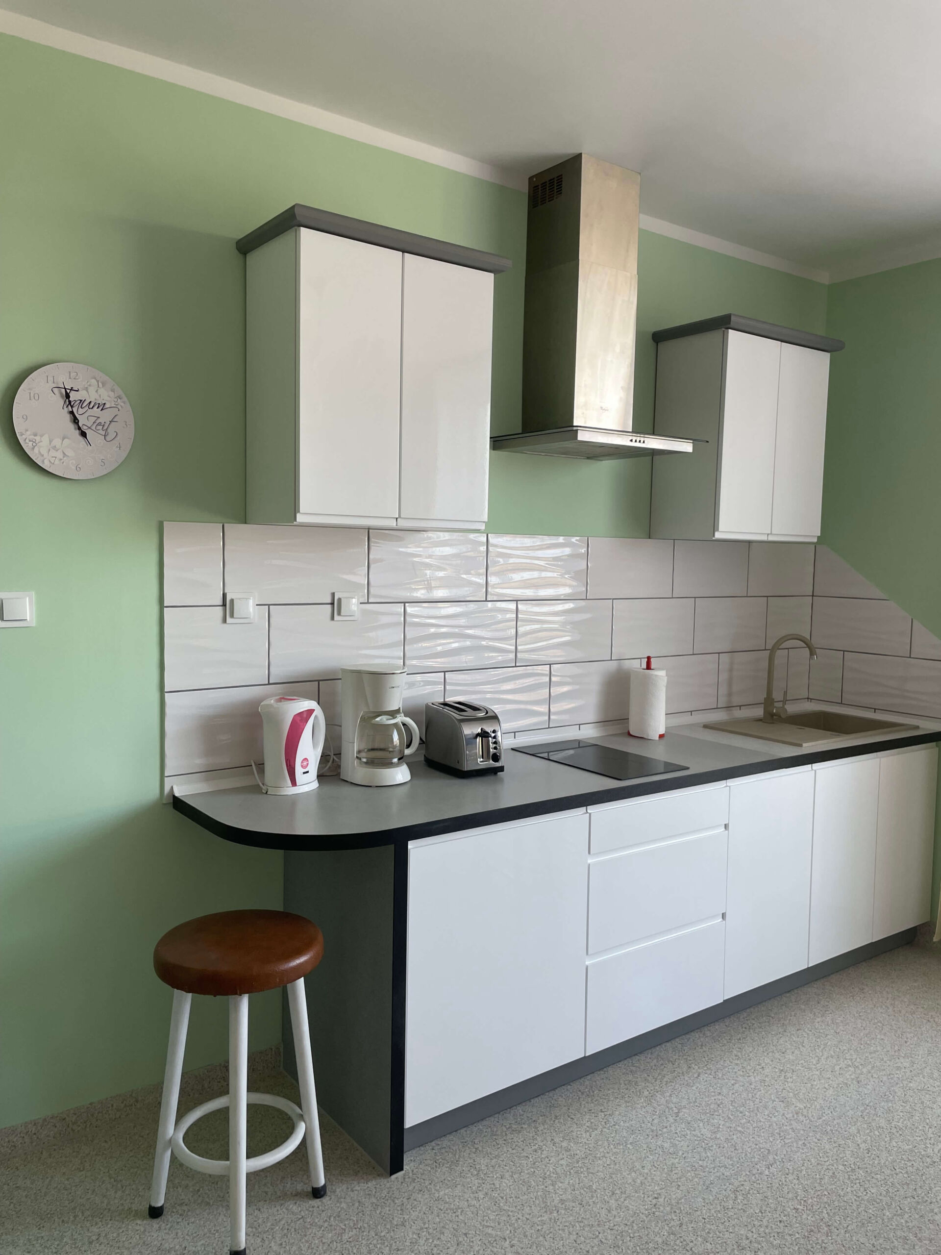 offene Küche, Kühlschrank, Wasserkocher, Kaffeemaschine, 2-er Kochplatte, Besteck & Geshir, Töpfe & Pfannen